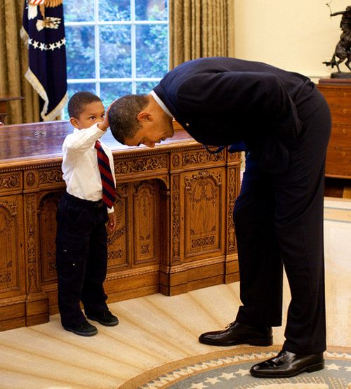 President Obama bends to 5-year-old Jacob Philadelphia, whose arm raised to touch the president’s hair — to see if it feels like his.